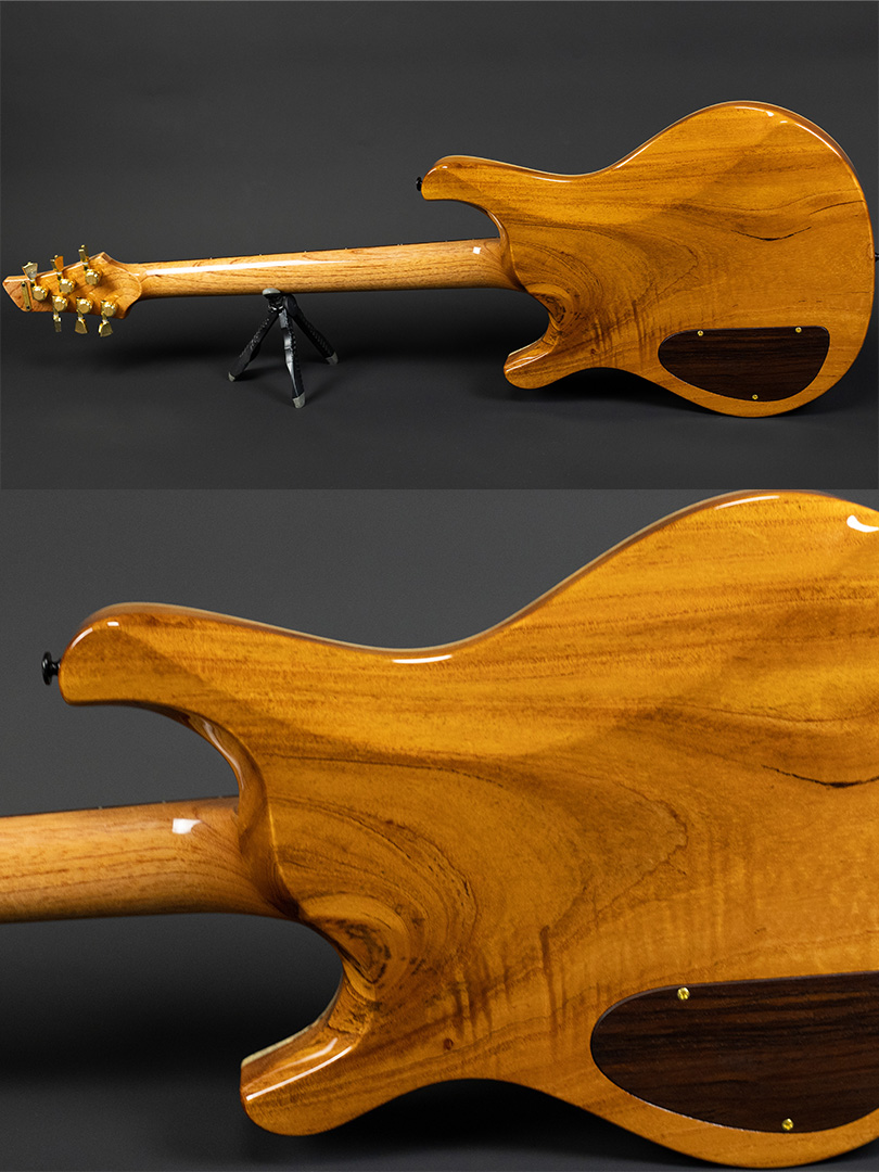 Deep carved Nepalese Mahogany body from a single solid slab – the top is bookmatched, figured Himalayan Ash