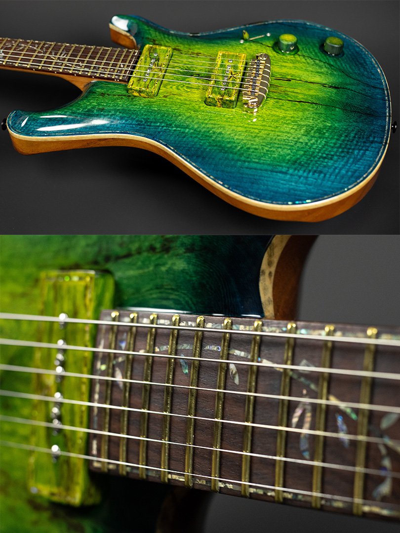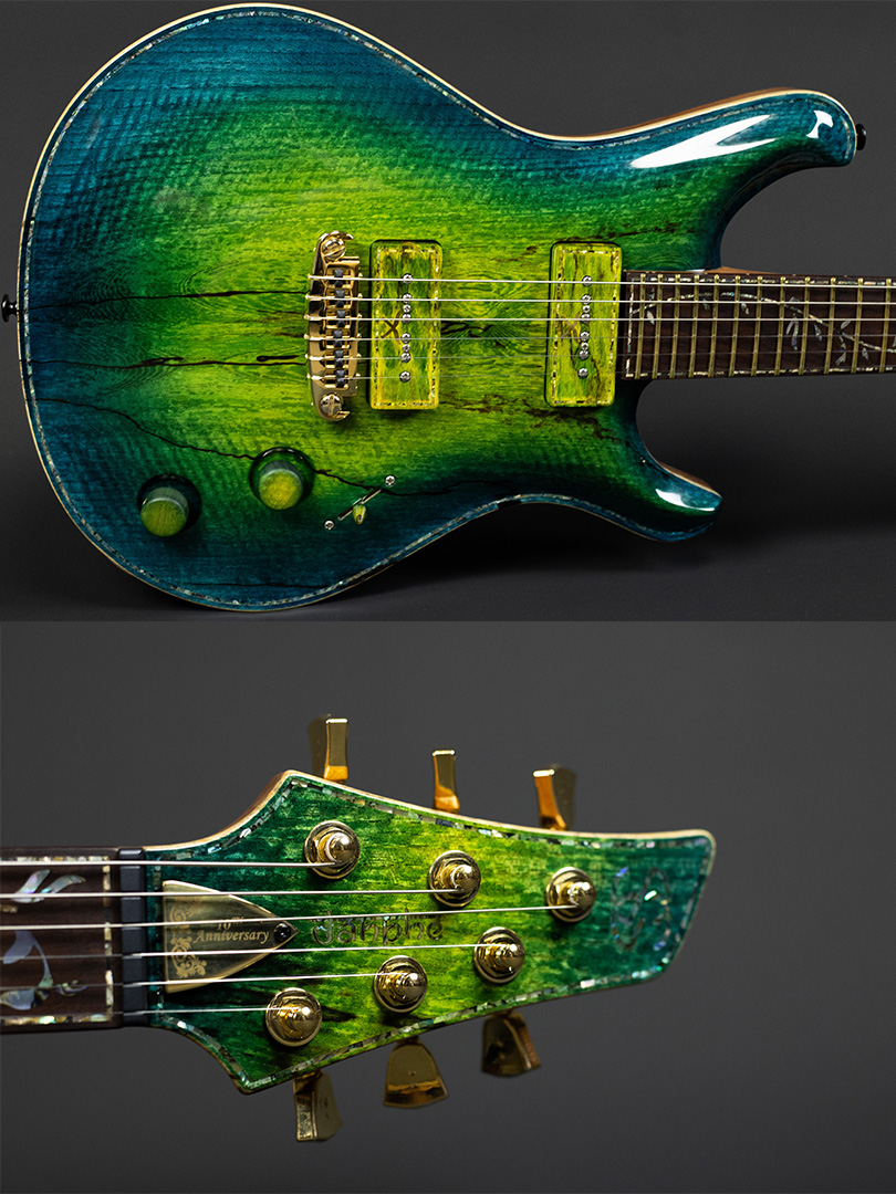 Gold hardware, featuring a Graphtech Wraparound bridge and Graphtech Ratio locking tuners, along with gold fretwire – a touch of elegance befitting this milestone